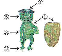 | 河童の特徴 @ 甲羅 A みずかき B 弾力性のある腕 C 皿(水が皿に入っている時は驚くほどの力を発揮する。) D とがった口先 |
