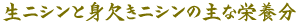 ニシンはニシンでも生のニシンや薫製のニシン、そしてニシン漬けに使う乾燥させた身欠きニシンなどがある。ここでは、生のニシンと身欠きニシンとの主な栄養分を比較したい。