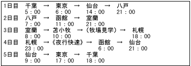 旅の行程は、4泊5日です。早朝5:00くらいに、家の近くの駅から列車に乗りました。本を 読んだり、景色を眺めたり、眠ったり、特に何をするでもなく、北をめざします。1日目は、