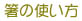 この箸(A)は支えるだけのものなので、動かしません。 中指と薬指で支えます。 もう一方の箸(B)は中指と人さし指のあいだに置き、親指で支えます。 食べ物をはさむときは、この箸(B)だけが動きます。 箸の先を開き、食べ物をはさんで見てください。 |