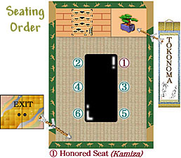 | 1) The honored seat (kamiza) is where the main guests sits. There is usually a tokonoma (alcove) with a kakejiku (hanging scroll) behind the kamiza. The seat is the farthest place from the entrance in a position where the guest can see the garden well. |