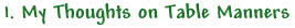 I became interested in table manners when I started to go to restaurants more frequently. I was concerned about how I should act and what to expect of the waiters and waitresses who served me. I also wondered about how I should behave while eating Japanese food. Although I eat Japanese food every day, I don't know very much about the etiquette that goes along with it. |