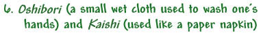 to the guest. Kaishi is used in almost the same way as a paper napkin. It can be used in a number of different ways. One example is when it is used to blot impurities from around the rim of the tea cup. It is also used as a small plate on which Japanese sweets are placed during the tea ceremony. |