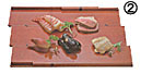‡@ sakitsuke (hors d'oeuvre) ‡A zensai (appetizer) ‡B suimono (clear soup) ‡C sashimi (slices of raw fish) ‡D nimono (stewed seafood and vegetables) ‡E yakimono (broiled fish) ‡F agemono (deep-fried seafood and vegetables) ‡G sunomono (vinegared seafood and vegetables) ‡H gohan (cooked rice) ‡I tomewan (miso soup) ‡J konomono (pickled vegetables) ‡K kudamono or mizugashi (fruit)