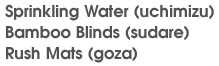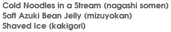 | Summer in Japan is very hot and humid. Nowadays, most people use air conditioners to keep cool indoors, but there are also many traditional Japanese ways of making summer more comfortable. Some of these ways use the sensations of sight, sound, and taste. These traditional methods of keeping cool come from the wisdom of our ancestors, who lived in a time when there were no air conditioners or refrigerators. We will introduce some special customs for summer that are unique to Japan. |