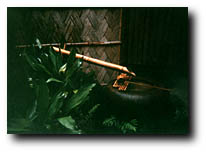 ![]() The shishiodoshi was originally used like a scarecrow in the fields to stop wild animals from eating produce. It is a cut bamboo cylinder that is supported by a fulcrum. As it fills up with water from above, it begins to lean to one side from the weight of the water. When it becomes too heavy, the bamboo bangs down against a stone below it and makes a sound. The shishiodoshi at Kyoto's Shisendo Temple is quite well-known. |