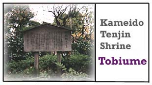 The meaning is as follows: If the wind blows from the east (from Kyoto, the capital), dear plum flower, please remember your master (Michizane himself) and send the smell of plums over the wind to Kyushu. Even though your master is not in Kyoto, please do not forget to bloom in spring. The plum tree flew from Kyoto to Kyushu in only one night after his death in Kyushu. "Tobiume" (flying plum) is based on this legend. There are some souvenir shops around Kameido Tenjin Shrine. One shop sell "Gokakuume" (pickled plum) that is connected with the legend of "Tobiume" and the fact that Michizane loved plums during his lifetime. |