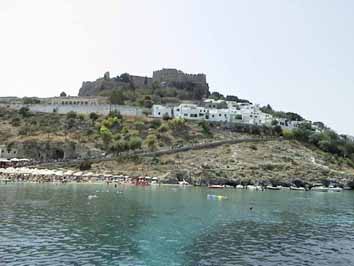船がリンドスの港に入ると、小高い丘が視界に飛び込んできました。頂上 に冠のように戴かれた中世の城壁、中腹に広がる白い家並み。ふもとの坂道を、ロバがゆっくりと登っていきます。「うむうむ、美しい」と口の中でつぶやいて、私は甲板のベンチから腰を上げました。 丘の頂上にはアクロポリスの跡があるというので、船を降りて早速坂道に向かいました。頂上までは、約二十分。靴のかかとで小さな砂埃を舞い上げ、昼の陽気にまどろみかけた白い家々の間を通り抜けて歩いていくうちに、背中がじっとりと汗ばんできます。ようやく城壁が見えた時、私は 安堵の息をつき、同時にはっとして左の岩壁をかえりみました。 |