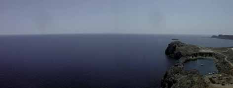島の人々なら、こうつけ足すでしょう。 そういうわけで、私はロードス市のマンドラキ港に足を運び、リンドス行きの船に乗りました。船は港を出て大きく右に旋回すると、広い海原をひたすら南下していきます。エーゲ海の色は、デュフィが描くような透明で音楽的な青かと想像していましたが、実際には純粋で硬質な、比類なき紺碧でした。 |