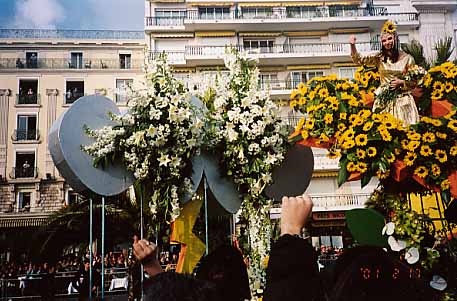 コートダジュール10日間の旅は、明るい陽ざしのもと、にぎやかな二一スのカーニバル見物から始まった。花で飾った車上の美女が投げるミモザの花に、沿道の人々がわれ先にと手をさしのべる。沿道の後ろは白いさざ波がうち寄せる紺碧の地中海。抜けるような青空と交わる水平線が長く続く。もう一つのお祭り"マントン"ではレモンとオレンジの実をぎっしりはめ込んだ巨大な人形たちのパレード。 |