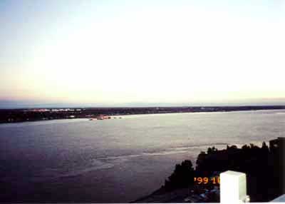 | ケベックの町は実にこじんまりとして、分かりやすく、城壁に囲まれた旧市街と州議事堂等のある新市街、それに川沿いに延びているロウワータウンに分けられます。旧市街は崖の上にあり、まるでヨーロッパの古い町のようです。 地図を見ながら朝の町を散策です。良いお天気ですが、みんなコートの襟を立てて歩いています。対岸がとても小さく見えるセントローレンス川に辿り着きました。モントリオールを出発して以来、ずっと見え隠れしていたこの雄大な川のほとりに 立つことが出来ました。ゆったりと流れる水量豊かなこの川は、この土地にどれほどの潤いを与えて居る事でしょう。海猫のような鳥がたくさん遊んでいます。写真は夕暮れのセントローレンス川です。 | |