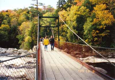 | ケベック近くのLe Canyon へ参りました。一寸おまけの感じで行ったのですが、なかなかどうして、スケールの大きな素晴らしい渓谷があり、先程立ち寄ったモンモラシーの滝よりもずーっと奥行きもあり、紅葉の山の狭間をどうどうと流れ落ちる滝、そこに架かる吊り橋、飛沫に浮かぶ虹、どれをとっても第一級の眺めでした。色々な角度から滝が眺められるように遊歩道が巡らされ、柔らかく散り敷く真っ赤な紅葉の葉を踏みながらの散策は、この上なく快いものでした。吊り橋も一寸スリルがあって、うきうき致しました。 出口の紅葉が真っ赤です。最高潮に燃えています。ほんとに良い所です。売店の売り子さんの女性が一人、口笛を吹いています堂々たる体格です。熱心に伴奏、間奏まで入れて今にも躍りださんばかりです。私も口笛でデュエットしたくなってしまいました。” |