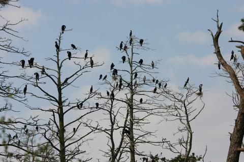 リーガで2日間文化遺産を見学したのち、西南へ300km強走り、リトアニアのバルト海に面したネリンガという砂嘴に入る。延々100km続く巨大な砂嘴だ。内海は入口はバルト海だが、巨大なラグーンは、奥で袋小路になっている。随って、海水から汽水へ更に淡水へと水質が変化し、それに連れて生息する魚介類も変わり、真に多様で魚食を好む鳥類にとっては格好の採餌場である。汽水域と思われる辺りの砂嘴に大きなウミウのコロニーがあった。さすが悧巧だ。