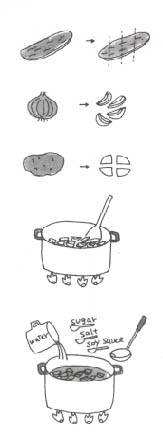 5. To (4), add the water and then the sugar, soy sauce and salt.