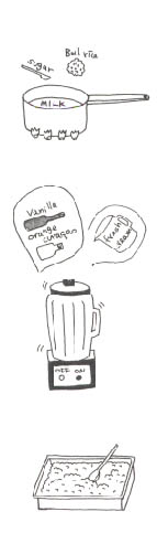 Rice Cream 6 servings 300min. 246kcal 1 . Place the rice and milk in a deep, sturdy saucepan and heat on high. Add the sugar and bring to a simmer. Reduce heat and simmer 15 to 20 minutes, stirring continuously to keep it from burning. Remove pan from heat and let it cool. 2. When (1) has cooled, combine it with the fresh cream in a food blender, mix till smooth. 3. Fold in the vanilla and orange cura~ao. Pour the mixture into the cake tin. 4, Place in the freezer about 2 hours. 5. Mix with a spoon and then pat down smooth again. Return