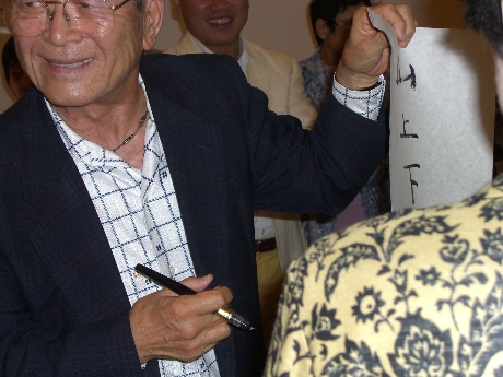 興味深げに見ていた面々は、やがて書き終わるそばから脇に控える私に、字が書かれた半紙を「もらっていいか?」と聞くので喜んで渡すと、意味も書いてくれと言うので、sun, moon, light などと書き添え、どんどん渡していたら筆ペンがかすれてきて、かきなぐり状態