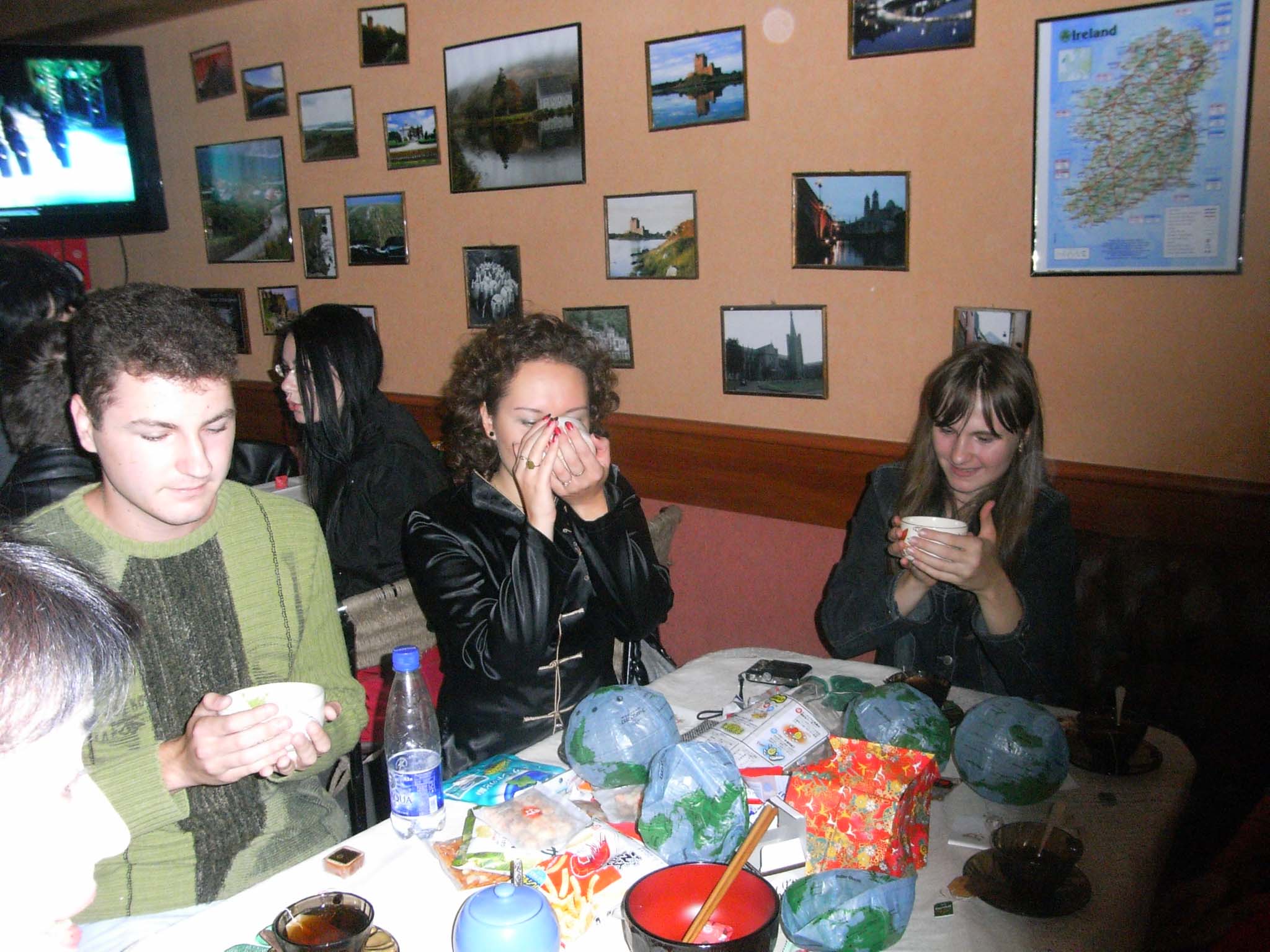ヤルタ3日目、キエフ行きの列車に乗る前、慌しくセヴァストーポリで現地の漫画クラブの若者たちとの交流会を行った。仕事の合間の貴重な時間をさいて、かけつけてくれた20代前半のかわいい若者たち13人ほどと、なぜか暗っぽい喫茶店のようなレストランで、英語、日本語で自己紹介をしあい、茶道のお手前を見せながら、一人一人にお茶を差し上げた。お茶は初めて目の前で見るせいかとても好評だ。ゆっくり日本語で話をする間もなかったが、彼らはかなり日本語の勉強をしていて、話せる人もいた。折り紙でツルの折り方を教えるつもりだったが、ナント彼らは「「折り紙、知ってます」」ということで、折って持っていったものを差し上げた。日本の四季風景や、日本の趣きある日本家屋の写真など持参した者もいたが、説明する時間もなく立ち去ることになってしまった。駅まで何人かが送ってくれ、別れを惜しんだ。