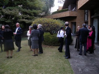 コーヒーもお菓子もとてもおいしかったです。 大使館の方に伺ったところ、日本人の方が全部作ったそうです。 大きさや味がとても日本人向きだったのはそのせいでしょうか。 ケーキのテーブルに白い長靴を花器として置いてあったのが印象的でした。 どなたのアイデアなのでしょう。 個人的なことで恐縮ですが 通訳のファッタさんに久し振りにお会いでき、感激でした。 以前、アウガルテンの工房で 絵付けをご一緒し、私はコーヒーカップを2客だけ作成しただけでしたが 今回お会いして伺ったら、この8年間に200個!?ものシリーズを作成したということでした。 そのようなことに興味のある方は 英語かドイツ語でアウガルテンの工房(ウイーン少年合唱団の学校の隣)で習うことができることをお伝えします。 日本人は器用なので熟練の人に負けない作品を作る人がたくさんです。 ドイツのマイセンは不況で 職人を世界中に派遣し絵付け教室をやっていると噂している人もいました。 準備や手配にいつもご苦労され、本当に感謝です。 良い思いをさせてもらい、 楽しい思いで帰らせてもらえる幸せをうまく表現できませんがお伝えできればいいのですが。KO 昨日はありがとうございました。 感想としては初めての大使館訪問でいい経験ができました。 コーヒーとケーキをご馳走になりながらの公使のプレゼンなどは良かったと思います。 本やCDのお土産には恐縮します。 また庭園散策や初めての方との懇談も良かったと思います。YT 11月9日のお茶会に参加させていただきまして、どうもありがとうございました。 とても素晴らしいひとときでした。 先月、姉妹3人でベネルクス三国へ行きました。 建物や美術館を列車及びその都市の乗り物を使って巡る旅で、 言葉のおぼつかない老姉妹の珍道中でしたが、地元の方々との触れ合いは心に残るものでした。 それぞれの都市の美しさに感動し、 ルクセンブルグの新市街では、ユーロの将来に向けた取り組みの意気込みに心動かされ、 次回の旅は、ユーロ圏の国々をもっと見てみたいと思っていた矢先に、この企画を知り参加させていただきました。 オーストリアといえば、お菓子に音楽、ハプスブルク家としか思い浮かばない私でしたが、 今回参加させていただき、とても興味がわきました。 原子力発電所の廃炉、農業に対する考え方、美しい自然の維持と管理、ハード面だけでなく、 人々の生活の中、考え方の中に脈々と繋がれている文化を伺い知りました。 おいしいケーキと美味しいワインで、ウィーンとエステルハジの香りを感じた、とても有意義なひとときでした。 貴重で楽しい時間を本当にありがとうございました。感謝を込めて。EM オーストリア大使館で講演とお茶の会とてもとても楽しく過ごすことができました。感謝一杯です。 最新のオーストリアの貴重な情報を沢山頂きました。 またコーヒーとケーキ そして中庭でのスパークリングワインと優雅にたおやかに時間が流れていきました。 また私の大好きなハイドンの御本とCDまで頂き嬉しさ倍増です。HS